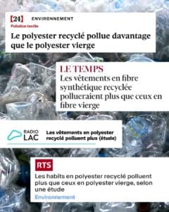 Des recherches menées à l’université Çukurova en Turquie, publiées par l’ONG Changing Markets, montrent que les vêtements en fibres synthétiques recyclées libèrent davantage de microplastiques lors du lavage : jusqu’à 55 % de plus que le polyester vierge, avec des particules 20 % plus petites, donc plus faciles à disperser dans l’environnement. Sachant qu’un seul cycle de lavage peut libérer jusqu’à 900 000 fibres dans l’eau.